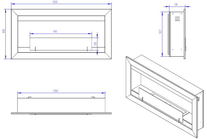 Su 1,20 m de longitud le confiere el impacto visual requerido cuando el hogar es el protagonista del lugar de estar. Su altura es levemente superior a la del Panorama, conservando su aspecto apaisado. Su profundidad permanece en 0,18 m, lo que le permite ser aplicado directamente sobre la pared, o idealmente empotrado, para lo cuál se debe hacer un calado en la pared de 1,10 m x 0,56 m x 0,195 m de profundidad.